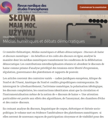 Malin Roitman, Grégoire Lacaze, Christophe Premat, Françoise Sullet-Nylander, and Samuel Vernet (eds.). Social media and digital platforms: polarization and hate speech. Nordic Journal of Francophone Studies 9(1). Stockholm: Stockholm University Press, 2026.